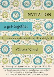 We are organising a get-together to celebrate and remember our dear friend Gloria on the 2nd September. The gathering will be in a lovely heritage plum orchard not far from where Gloria lived and where she recently did a lovely photo story for Landlove Magazine. (see this month’s edition).